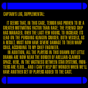 added, "If both ships were to increase to maximum, sir, the Ferengi could still beat us there by about two hours.